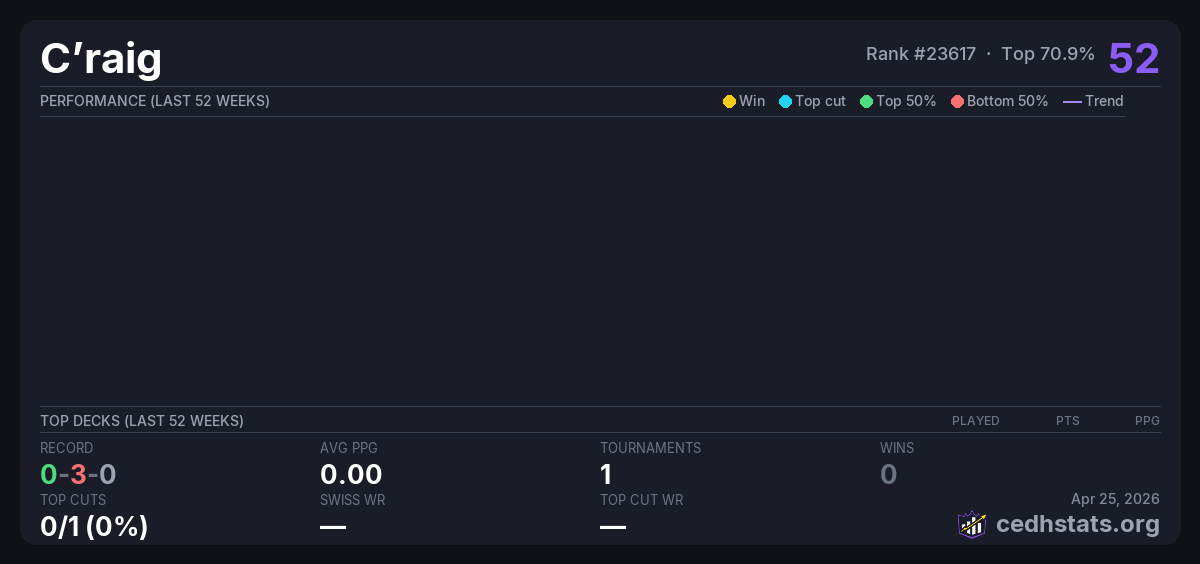 | Manic Monday Dec 30, 2025 · 29 players | 18/29 | 0-3-0 | 0.00 | 52 |