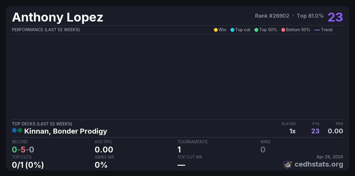 | Merlion Monthly April: Tropical Island Apr 25, 2026 · 57 players | Kinnan, Bonder Prodigy | 48/57 | 0-5-0 | 0.00 | 23 |