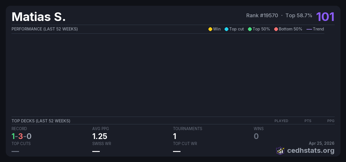 | Ludik edh Aug 31, 2025 · 20 players | Invalid pairing | 6/20 | 1-3-0 | 1.25 | 101 |