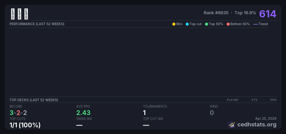 | CommandFest Beijing 2025 Aug 16, 2025 · 60 players | Invalid pairing | 3/60 | 3-2-2 | 2.43 | 614 |