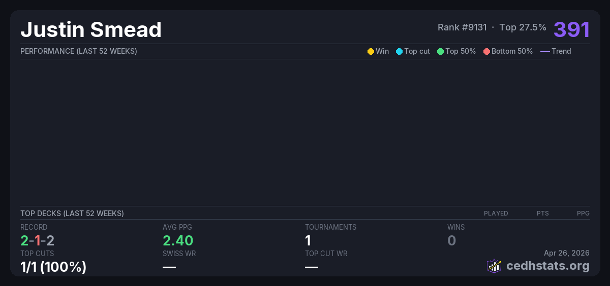 | 2025 September CEDH Sep 27, 2025 · 16 players | Invalid pairing | 2/16 | 2-1-2 | 2.40 | 391 |