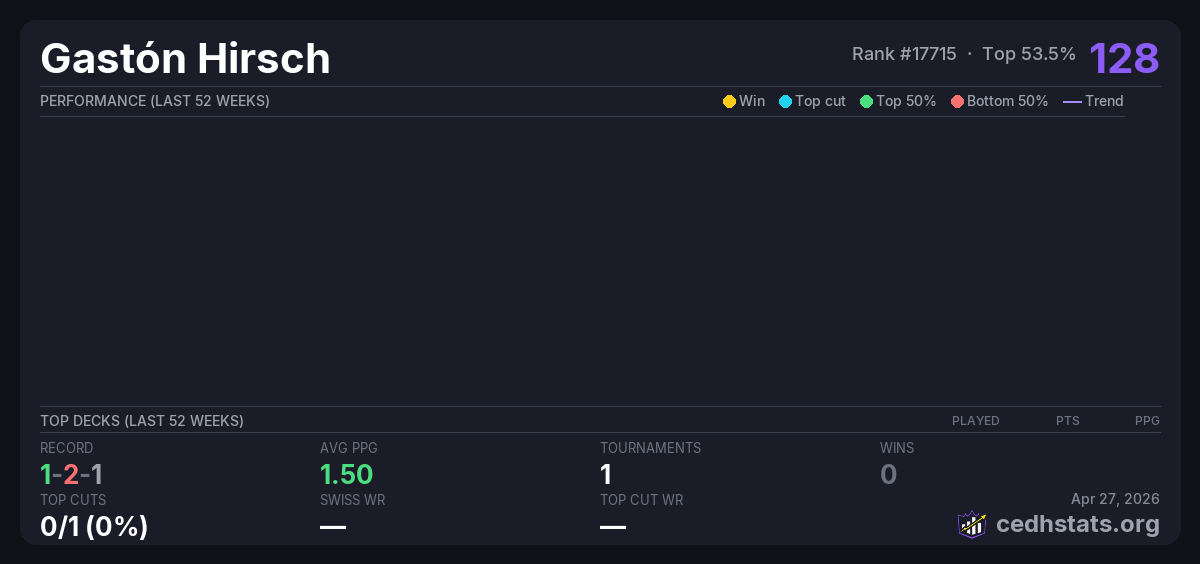 | Clasificatorio al Hall of Fame en el Ojo Jul 26, 2025 · 28 players | Invalid pairing | 10/28 | 1-2-1 | 1.50 | 128 |