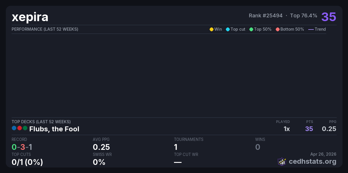 | Thrasios with the Candle stick 5k Apr 25, 2026 · 52 players | Flubs, the Fool | 41/52 | 0-3-1 | 0.25 | 35 |