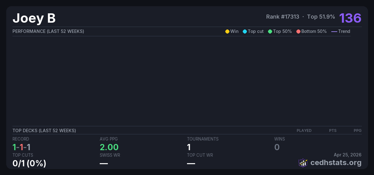 | April Qualifier Mar 16, 2026 · 20 players | 6/20 | 1-1-1 | 2.00 | 136 |