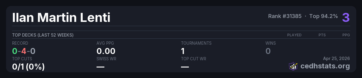 | Torneo Clasificatorio al HoF en el Ojo Apr 26, 2025 | Invalid pairing | 32/33 | 0-4-0 | 1 |