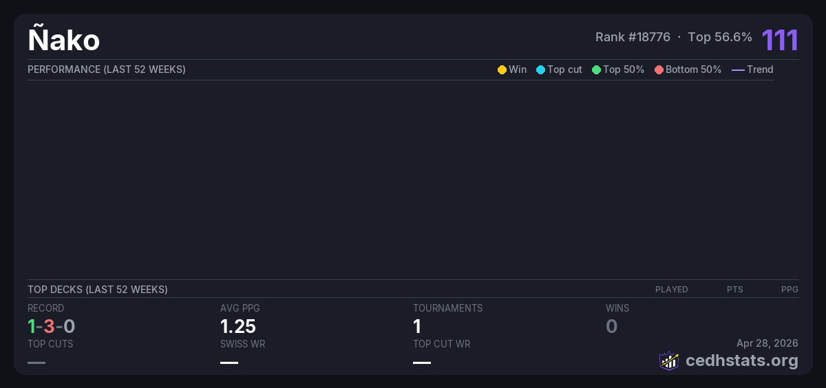 | Torneo Ludik 25/10 OH WOW Oct 25, 2025 · 20 players | Invalid pairing | 7/20 | 1-3-0 | 1.25 | 111 |