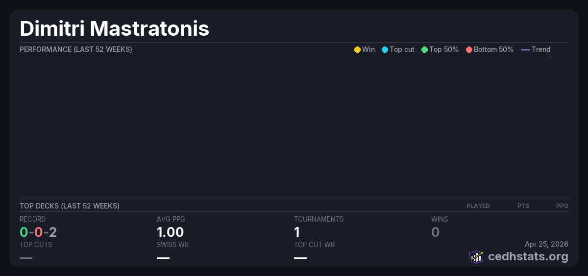 | Saturday Night Commander @ Beyond Odyssey! Jan 31, 2026 · 24 players | 10/24 | 0-0-2 | 1.00 | — |