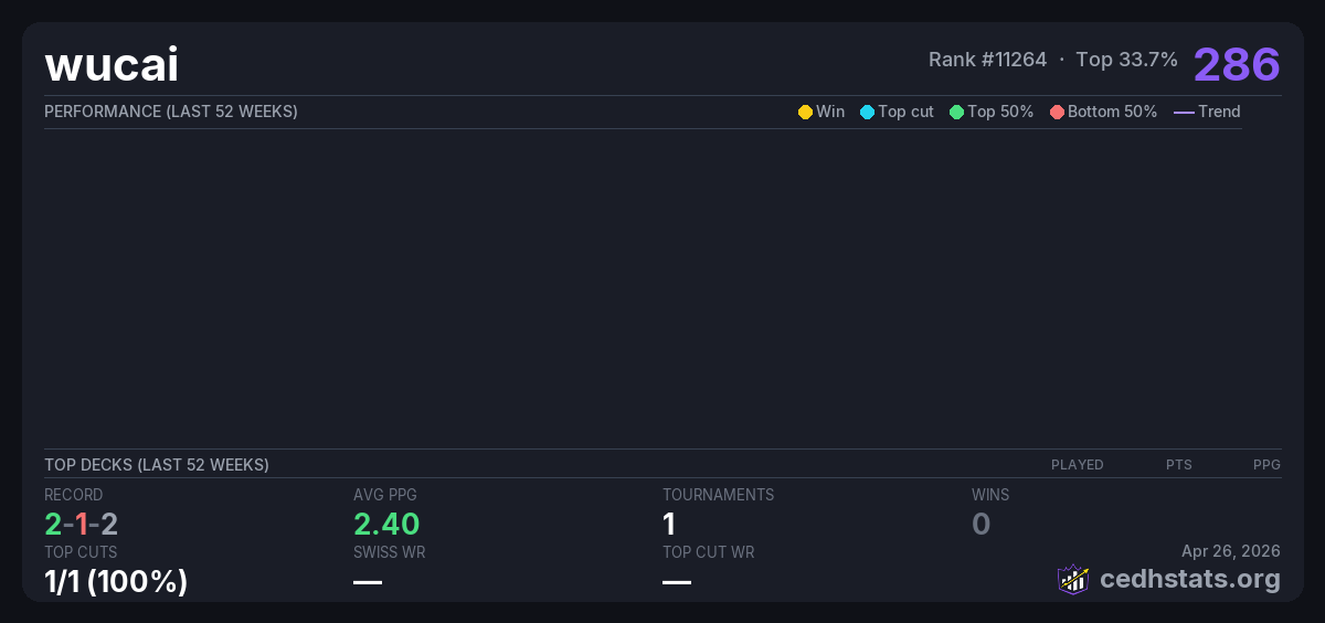 | Nanjing cEDH Cup Feb 22, 2026 · 16 players | 2/16 | 2-1-2 | 2.40 | 287 |
