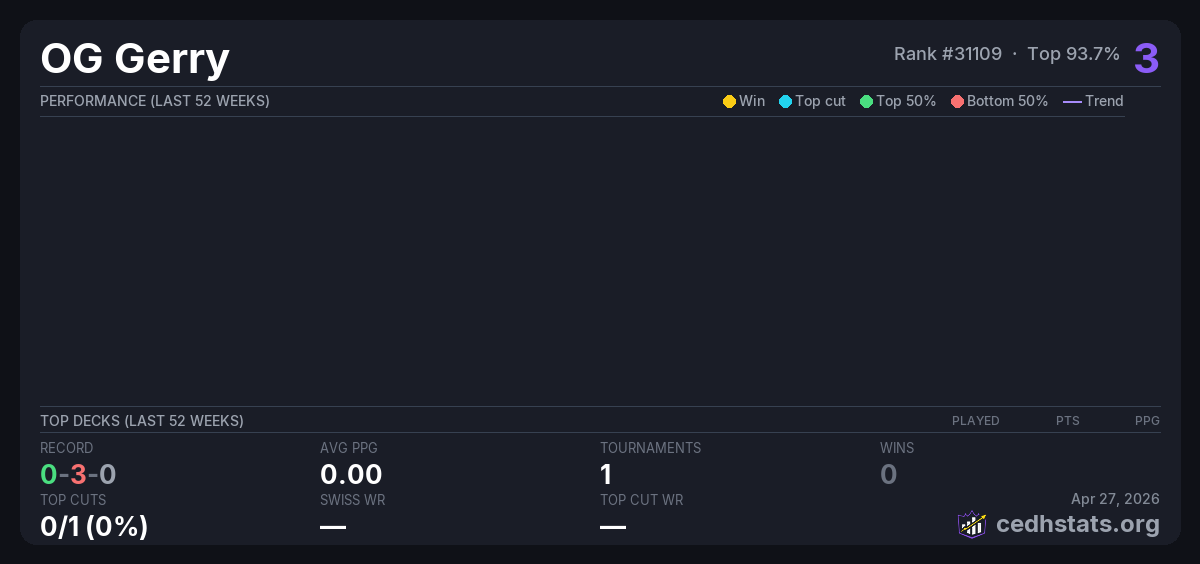 | Thirsty Thursday Aug 07, 2025 · 16 players | — | 15/16 | 0-3-0 | 0.00 | 3 |