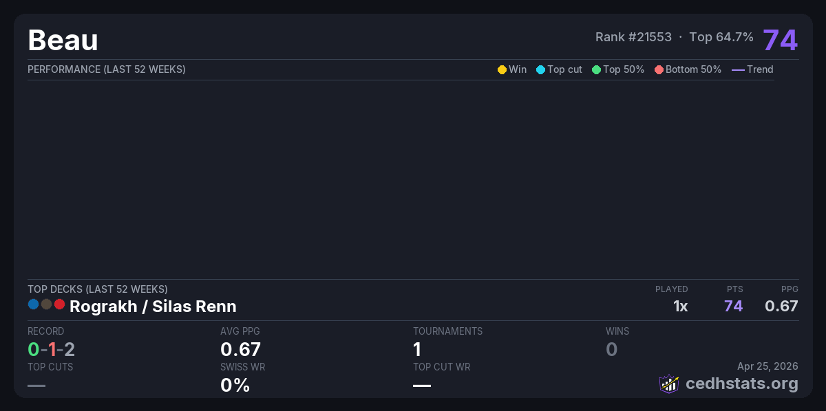 | Oasis Games cEDH Circuit (REAL ONE) 4-23-26 Apr 24, 2026 · 21 players | Rograkh / Silas Renn | 13/21 | 0-1-2 | 0.67 | 74 |