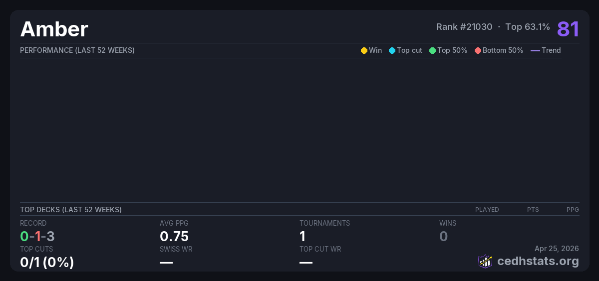 | Unaltered Precon Nov 16, 2025 · 24 players | Invalid pairing | 11/24 | 0-1-3 | 0.75 | 81 |