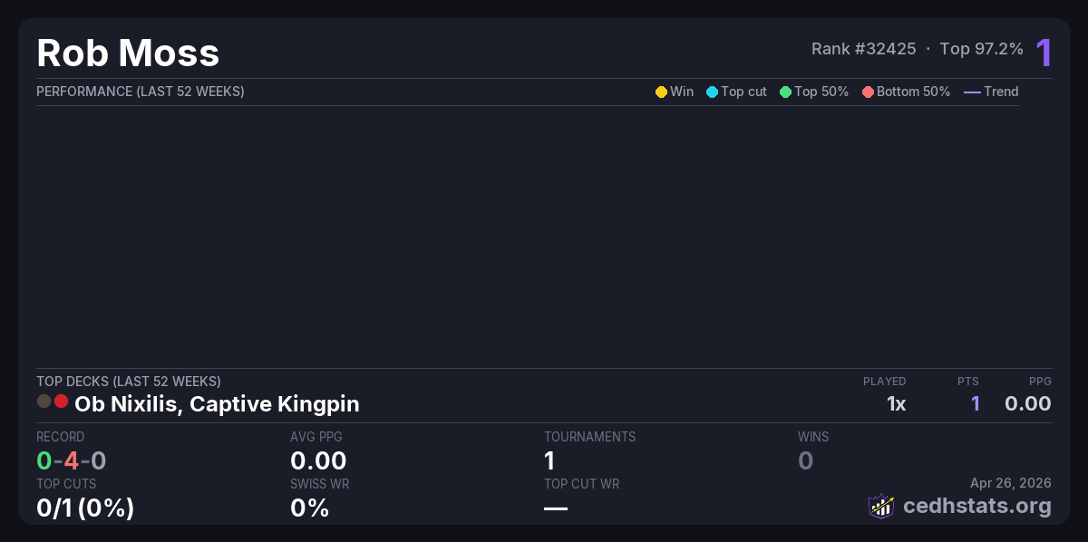 | TapStart Games “Tundra Down Unda” Apr 25, 2026 | Ob Nixilis, Captive Kingpin | 25/25 | 0-4-0 | 1 |