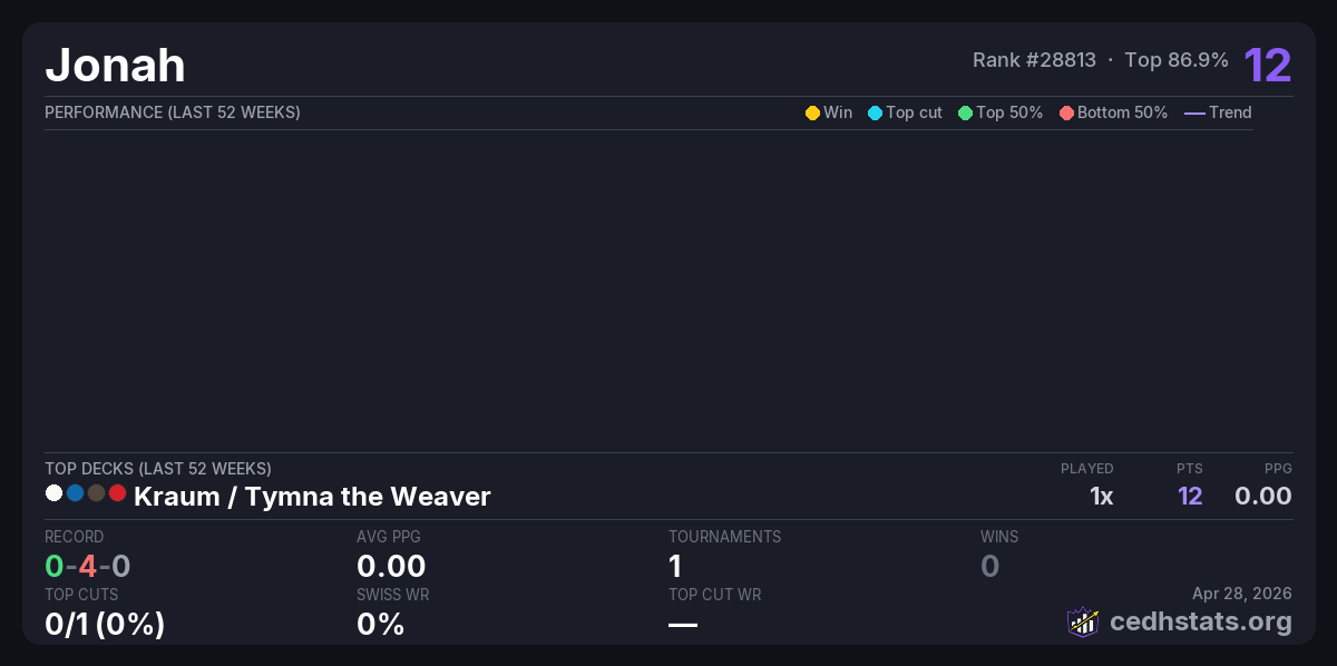 | April CEDH Win-A-Dual Apr 25, 2026 · 17 players | Kraum / Tymna | 15/17 | 0-4-0 | 0.00 | 12 |