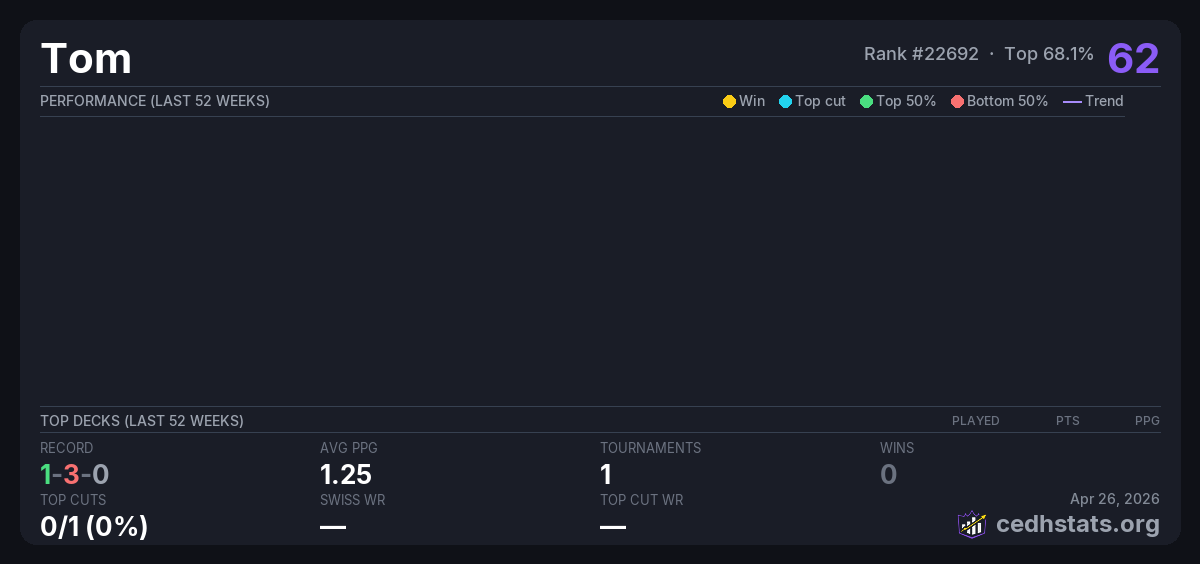 | CEDH Proxy Friendly Hive Tournament Nov 30, 2025 · 20 players | 11/20 | 1-3-0 | 1.25 | 62 |