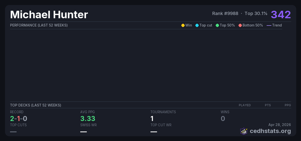 | CMFNM Aug 02, 2025 · 39 players | — | 2/39 | 2-1-0 | 3.33 | 342 |