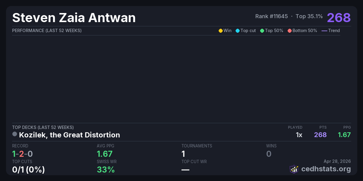 | AZMS CEDH League Qualifier #3 Apr 25, 2026 · 21 players | Kozilek, the Great Distortion | 8/21 | 1-2-0 | 1.67 | 268 |