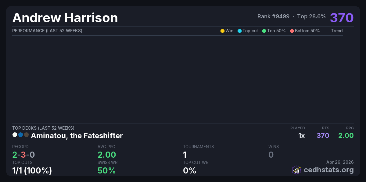 | TGL April Bracket 4 Tournament Apr 25, 2026 · 18 players | Aminatou, the Fateshifter | 2/18 | 2-3-0 | 2.00 | 370 |