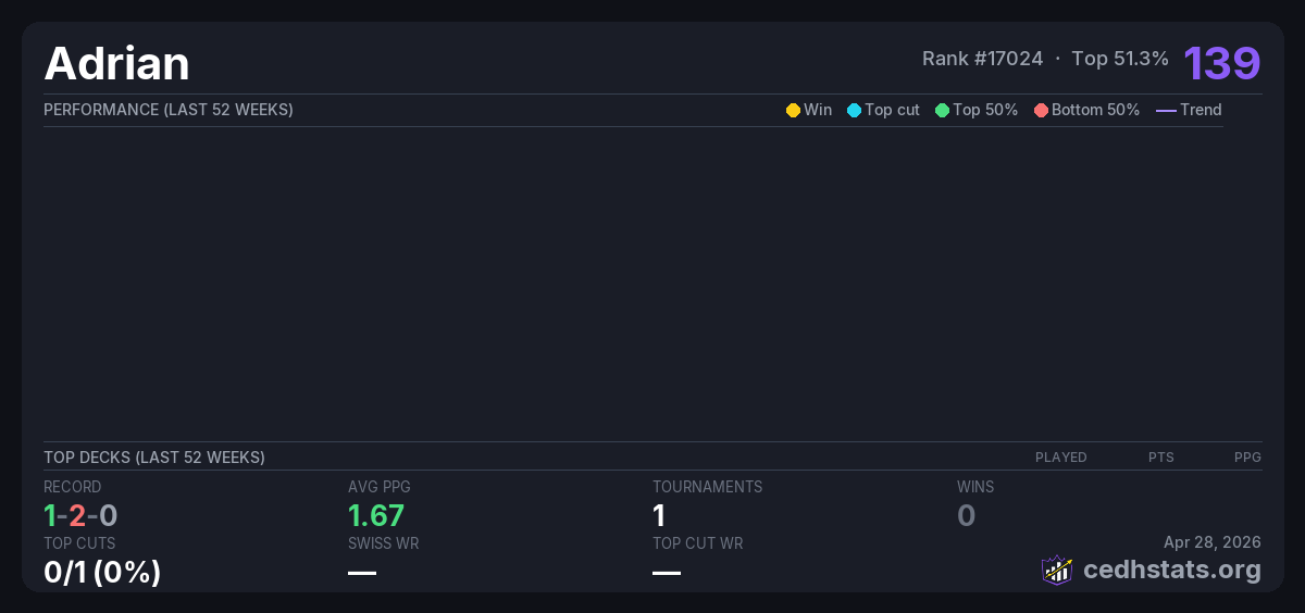 | Tournament | Deck | Result | Record | PPG | Points ? |