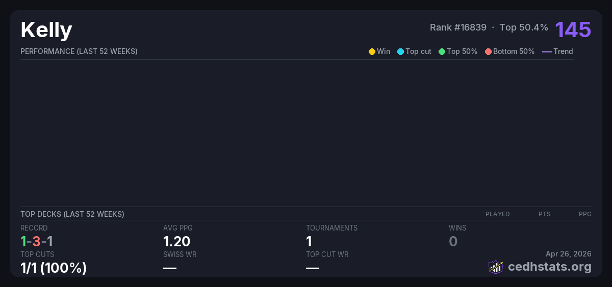 | Mono-color B3 Feb 22, 2026 · 17 players | 7/17 | 1-3-1 | 1.20 | 146 |