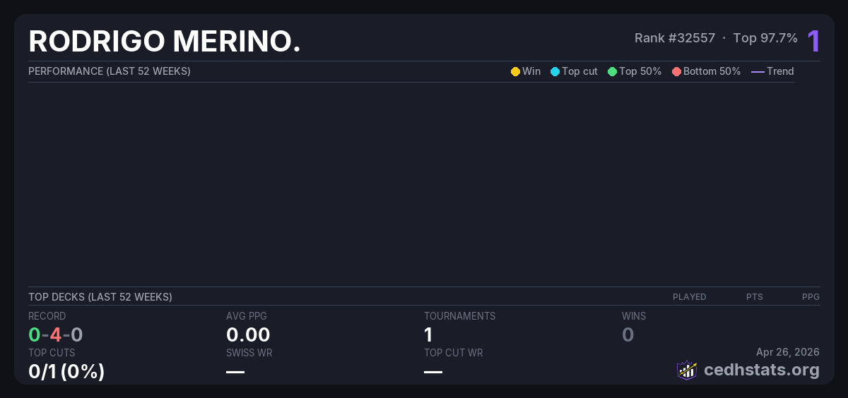 | CEDH HAMMER TCG STORE Sep 27, 2025 · 20 players | Invalid pairing | 20/20 | 0-4-0 | 0.00 | 1 |