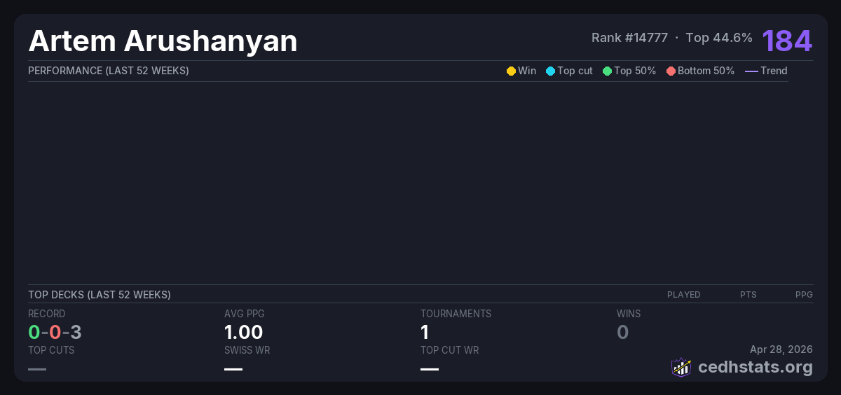 | Commander Tuesday - Nov 18th Nov 19, 2025 | Invalid pairing | 6/25 | 0-0-3 | 184 |