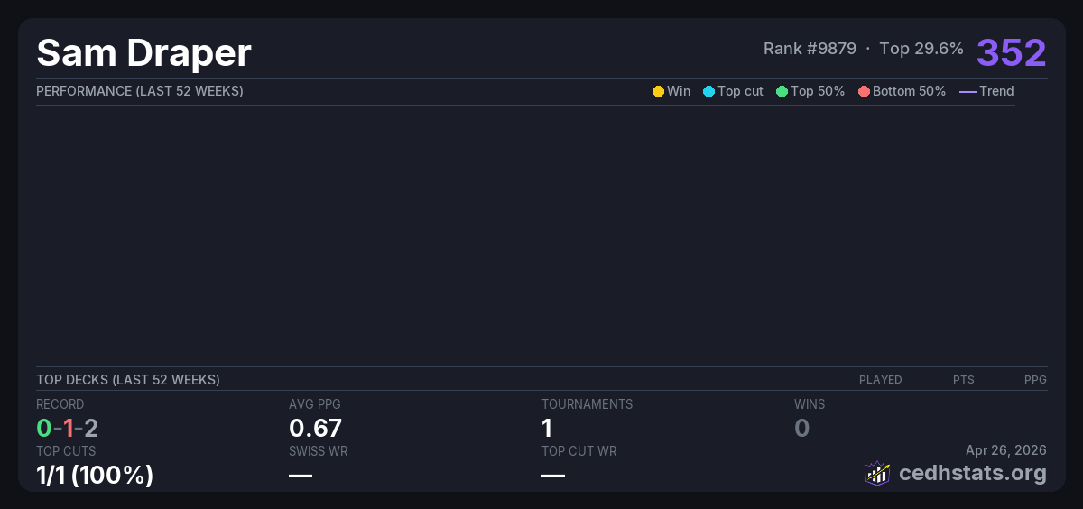 | Tournament | Deck | Result | Record | PPG | Points ? |