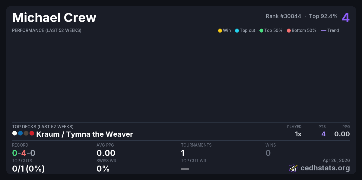 | Game On Win-A-Vault Cedh April 25th Apr 25, 2026 · 43 players | Kraum / Tymna | 40/43 | 0-4-0 | 0.00 | 4 |