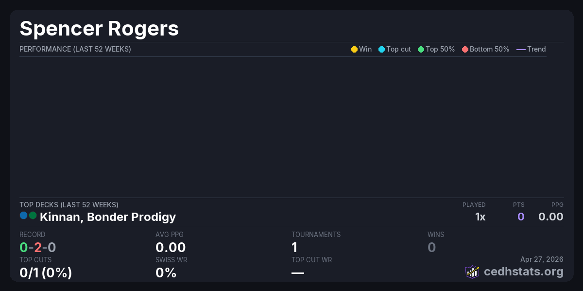 | Twisted Power - Midwest Gaming Classic TimeTwister Tournament Apr 25, 2026 · 172 players | Kinnan, Bonder Prodigy | 117/172 | 0-2-0 | 0.00 | — |
