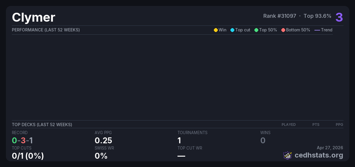 | CEDH at Chic & Geek Apr 26, 2026 | — | 19/20 | 0-3-1 | 3 |