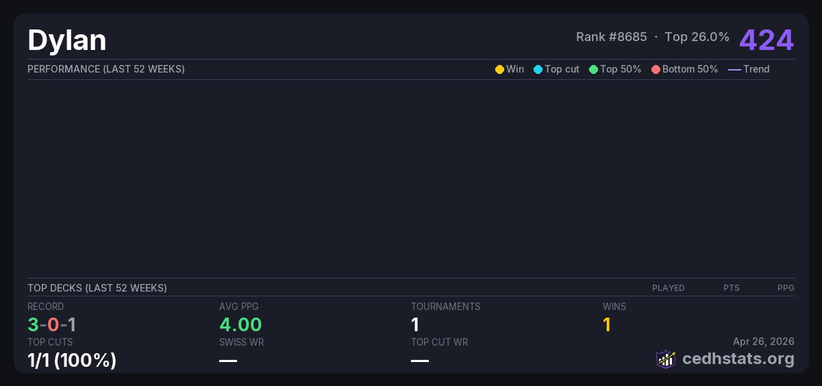 | Dragon's Nest T.SP.M.T 25$ (Copy) May 18, 2025 · 19 players | Invalid pairing | 1/19 | 3-0-1 | 4.00 | 424 |