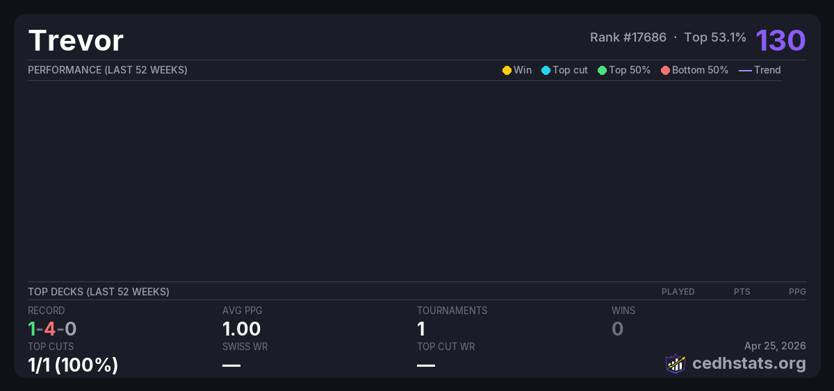 | Test Event Apr 30, 2025 · 24 players | Invalid pairing | 9/24 | 1-4-0 | 1.00 | 130 |