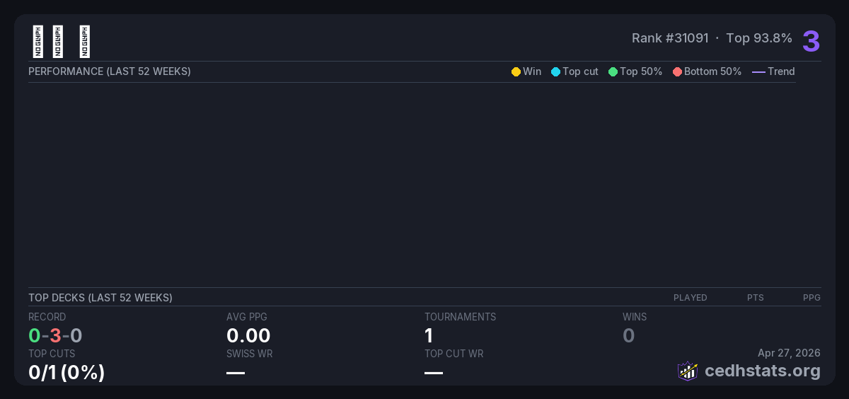 | 6月22日CEDH月赛 Jun 22, 2025 · 28 players | Invalid pairing | 26/28 | 0-3-0 | 0.00 | 3 |