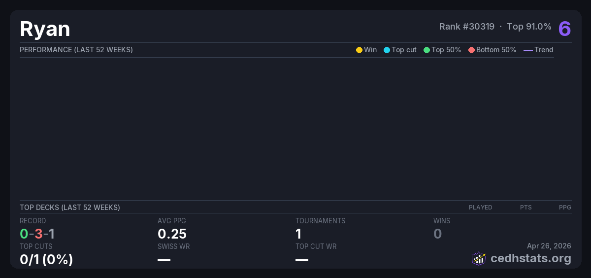 | Unaltered Precon Feb 08, 2026 · 19 players | 17/19 | 0-3-1 | 0.25 | 6 |