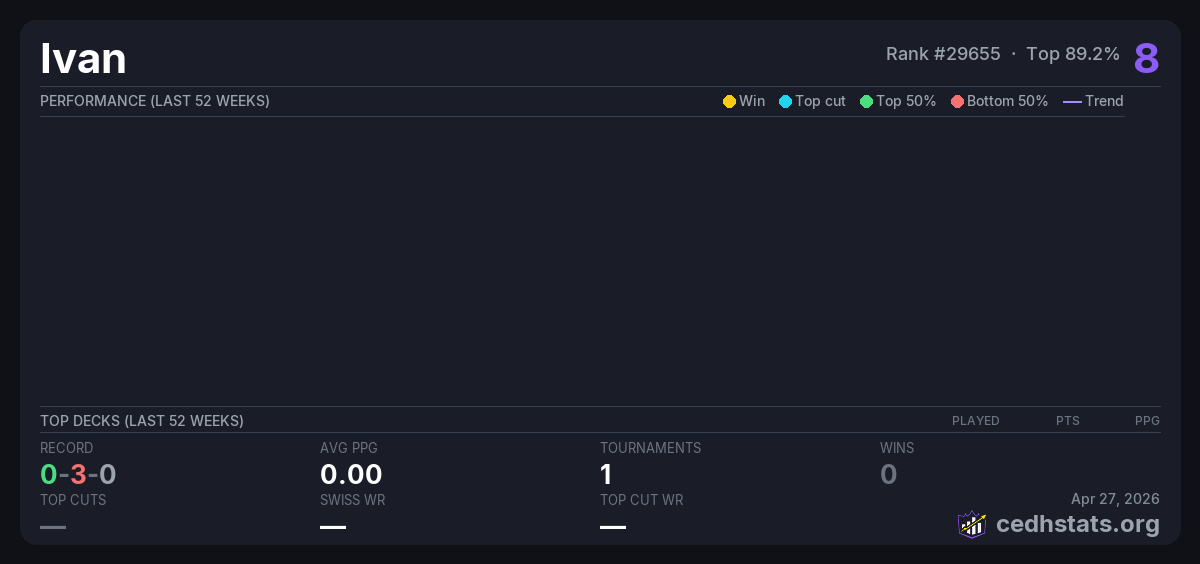 | Magic 2.0 #1 May 23, 2025 · 16 players | Invalid pairing | 14/16 | 0-3-0 | 0.00 | 8 |