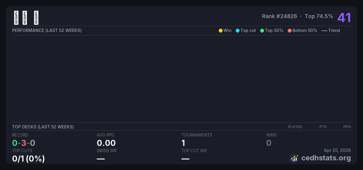 | 8月10日 CEDH月赛 Aug 10, 2025 · 32 players | Invalid pairing | 21/32 | 0-3-0 | 0.00 | 41 |