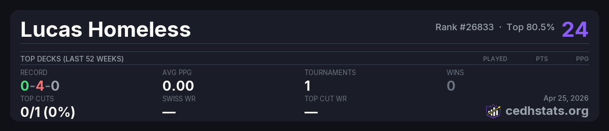 | Torneo Clasificatorio al HoF en el Ojo Apr 26, 2025 | Invalid pairing | 28/33 | 0-4-0 | 10 |