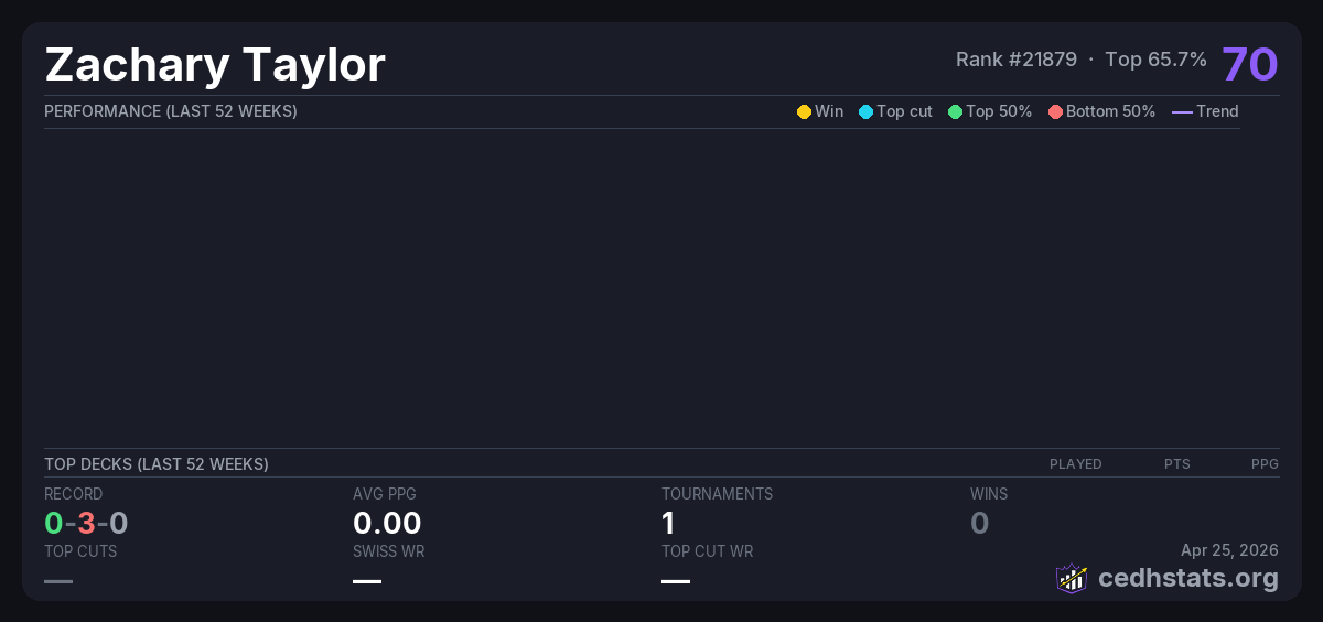 | Commander Wednesday Weekly Jan 14, 2026 · 44 players | 27/44 | 0-3-0 | 0.00 | 70 |