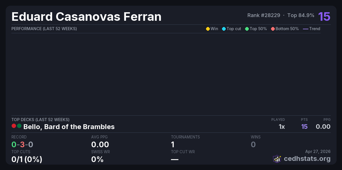 | Bcedh Magic Events Apr 25, 2026 · 22 players | Bello, Bard of the Brambles | 18/22 | 0-3-0 | 0.00 | 15 |