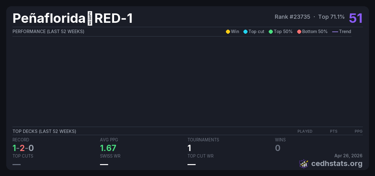 | Bracket 3 Commander Sep 21, 2025 · 20 players | — | 12/20 | 1-2-0 | 1.67 | 51 |