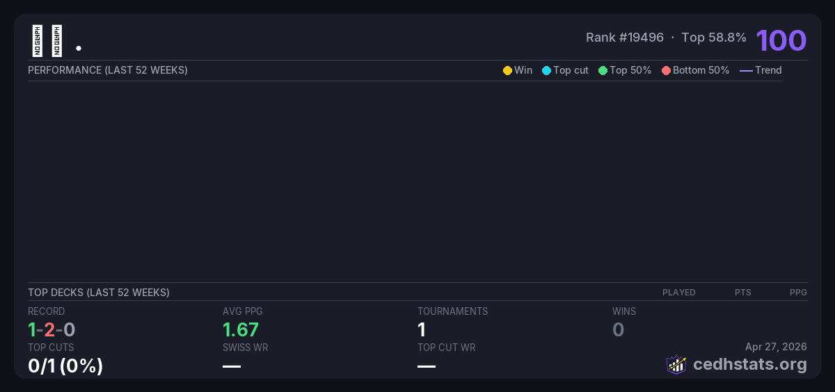 | 6月22日CEDH月赛 Jun 22, 2025 | Invalid pairing | 12/28 | 1-2-0 | 100 |