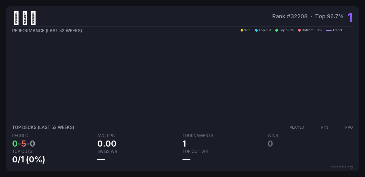 | CommandFest Beijing 2025 Aug 16, 2025 · 60 players | Invalid pairing | 58/60 | 0-5-0 | 0.00 | 1 |