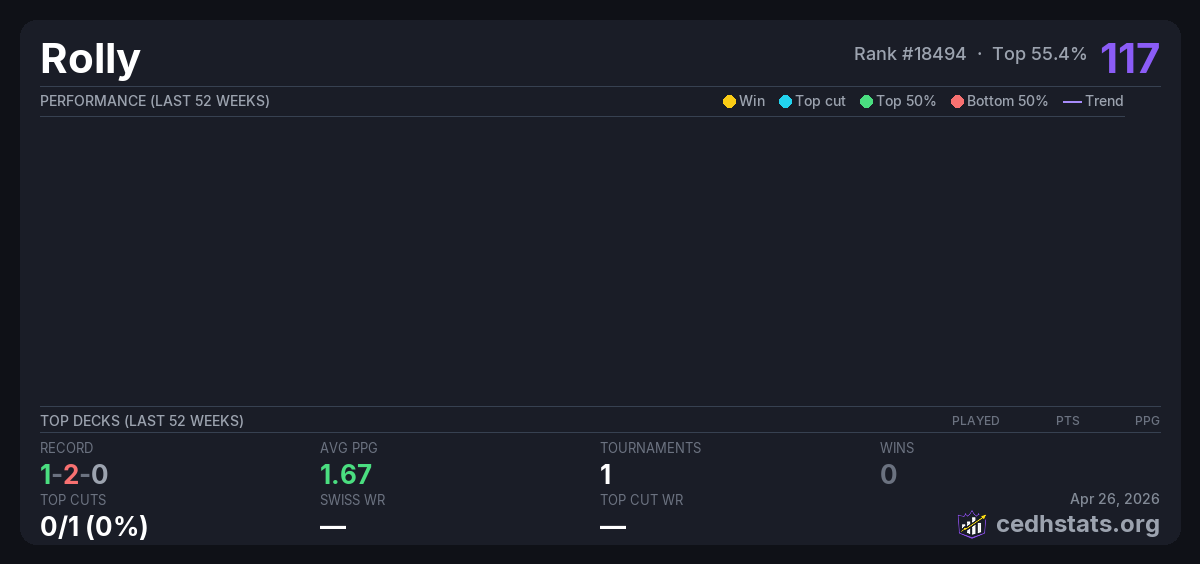 | Weekend Warriors Aug 02, 2025 · 16 players | — | 5/16 | 1-2-0 | 1.67 | 117 |