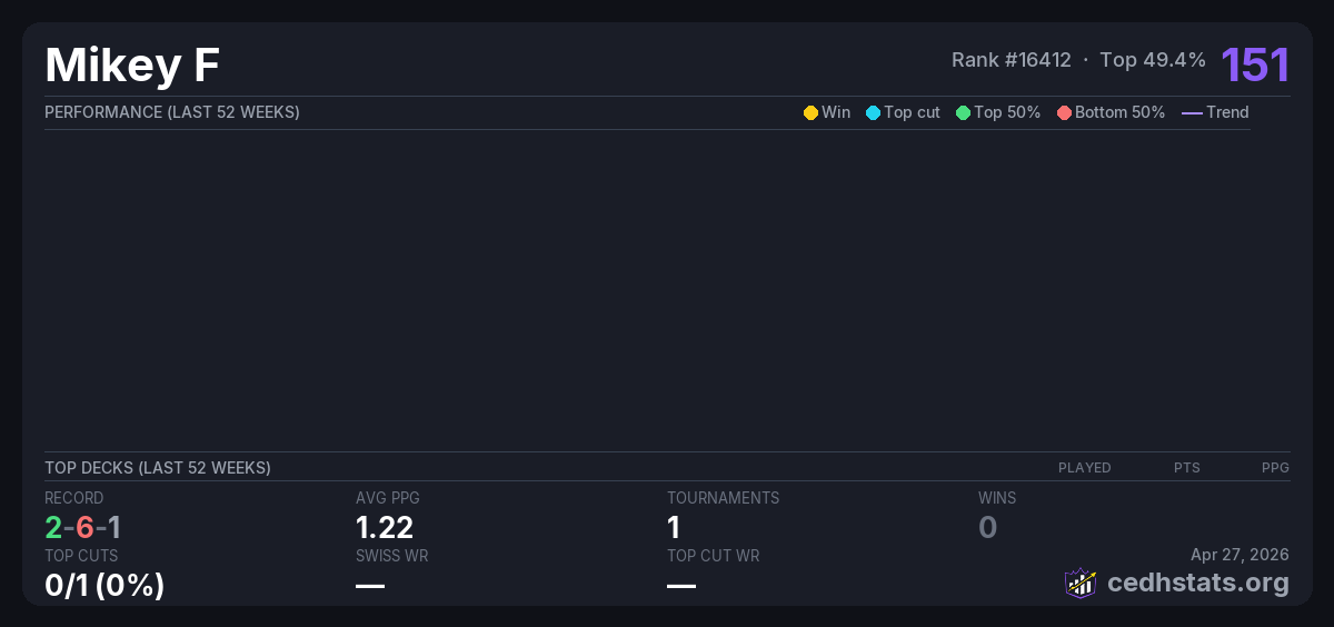| Iron Lion June CEDH League Jun 04, 2025 · 17 players | — | 5/17 | 2-6-1 | 1.22 | 151 |