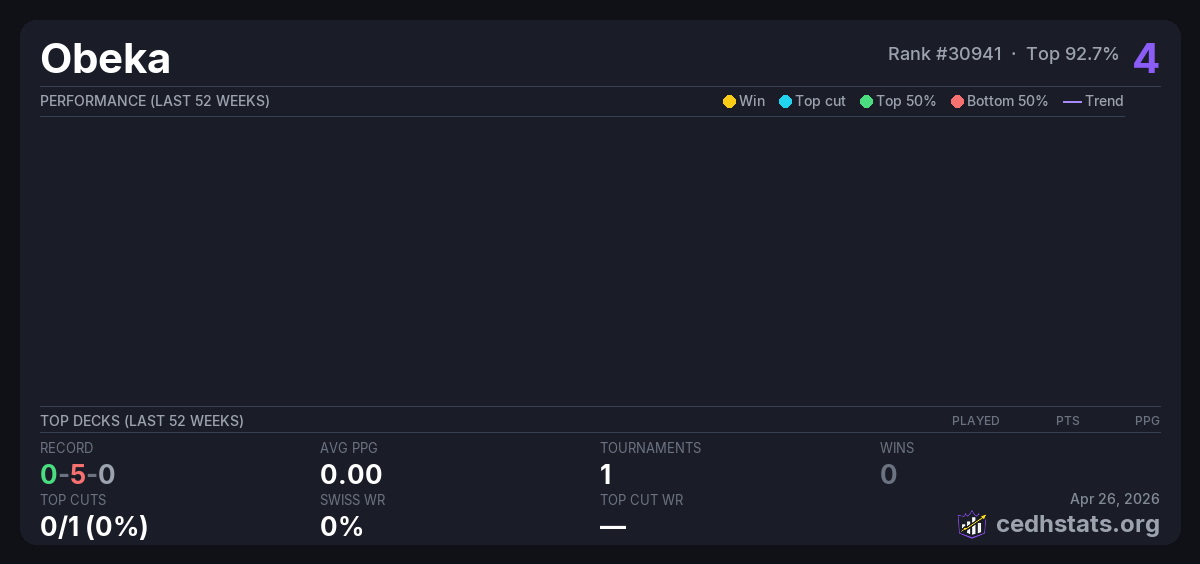 | Thrasios with the Candle stick 5k Apr 25, 2026 · 52 players | — | 49/52 | 0-5-0 | 0.00 | 4 |