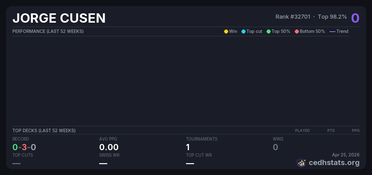 | CEDHXL Dec 04, 2025 · 24 players | 24/24 | 0-3-0 | 0.00 | 0 |