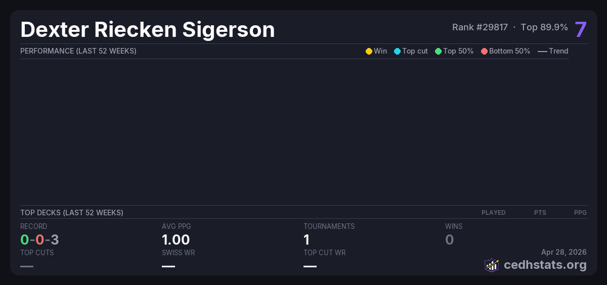 | Commander Tuesday - Nov 18th Nov 19, 2025 | Invalid pairing | 22/25 | 0-0-3 | 7 |