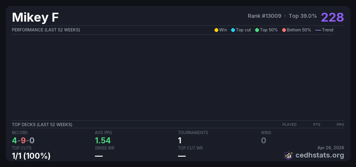 | The Iron Lion March CEDH League Mar 04, 2026 · 16 players | — | 3/16 | 4-9-0 | 1.54 | 228 |