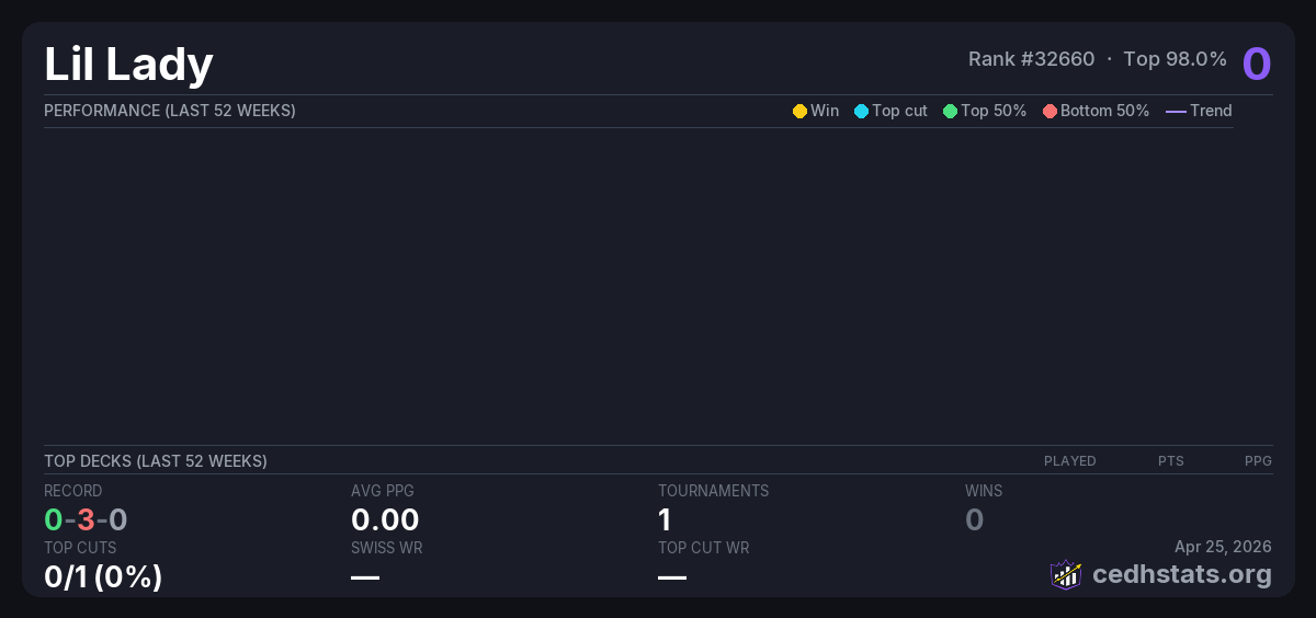 | Thirsty Thursday Dec 19, 2025 · 24 players | 24/24 | 0-3-0 | 0.00 | 1 |