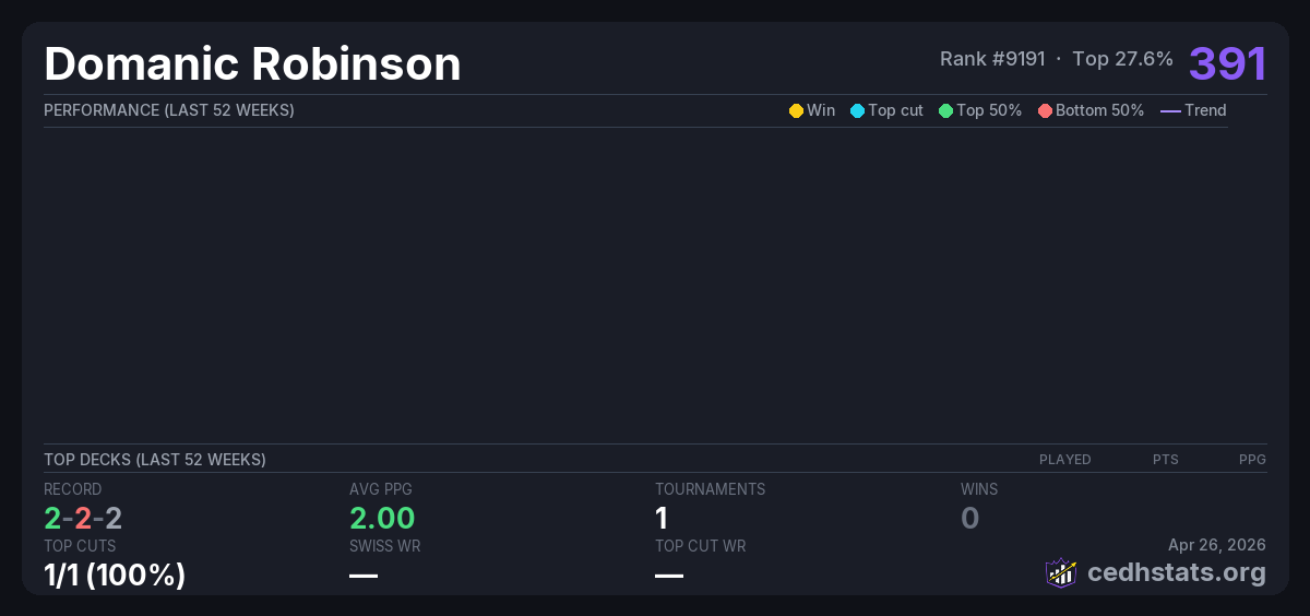 | 2025 August CEDH Aug 16, 2025 · 22 players | Invalid pairing | 3/22 | 2-2-2 | 2.00 | 391 |