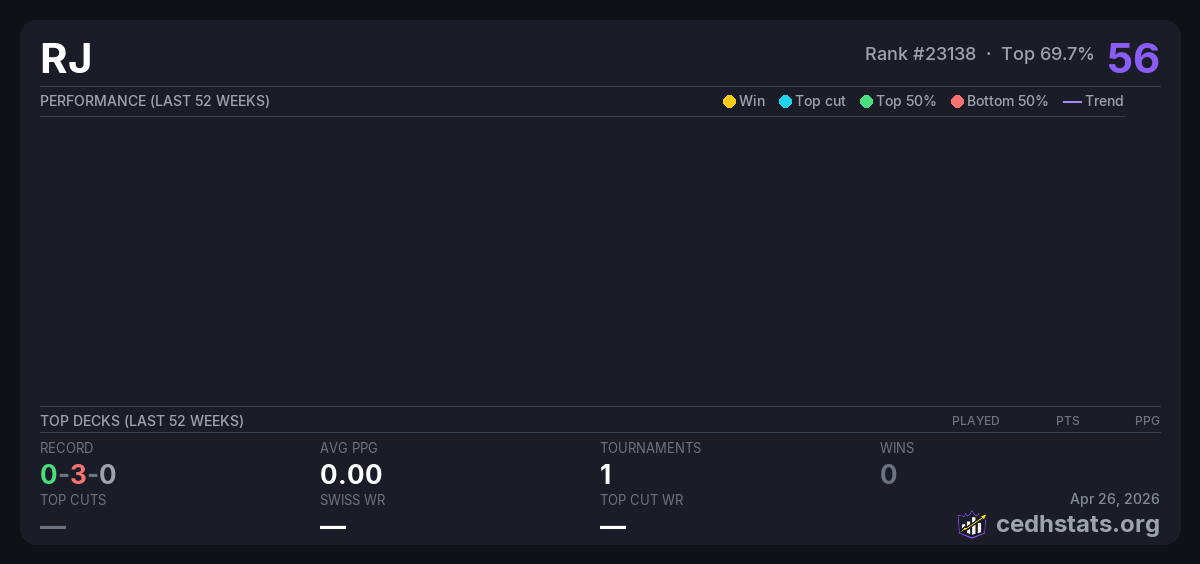 | Commander League 10 Jun 28, 2025 | — | 9/16 | 0-3-0 | 56 |